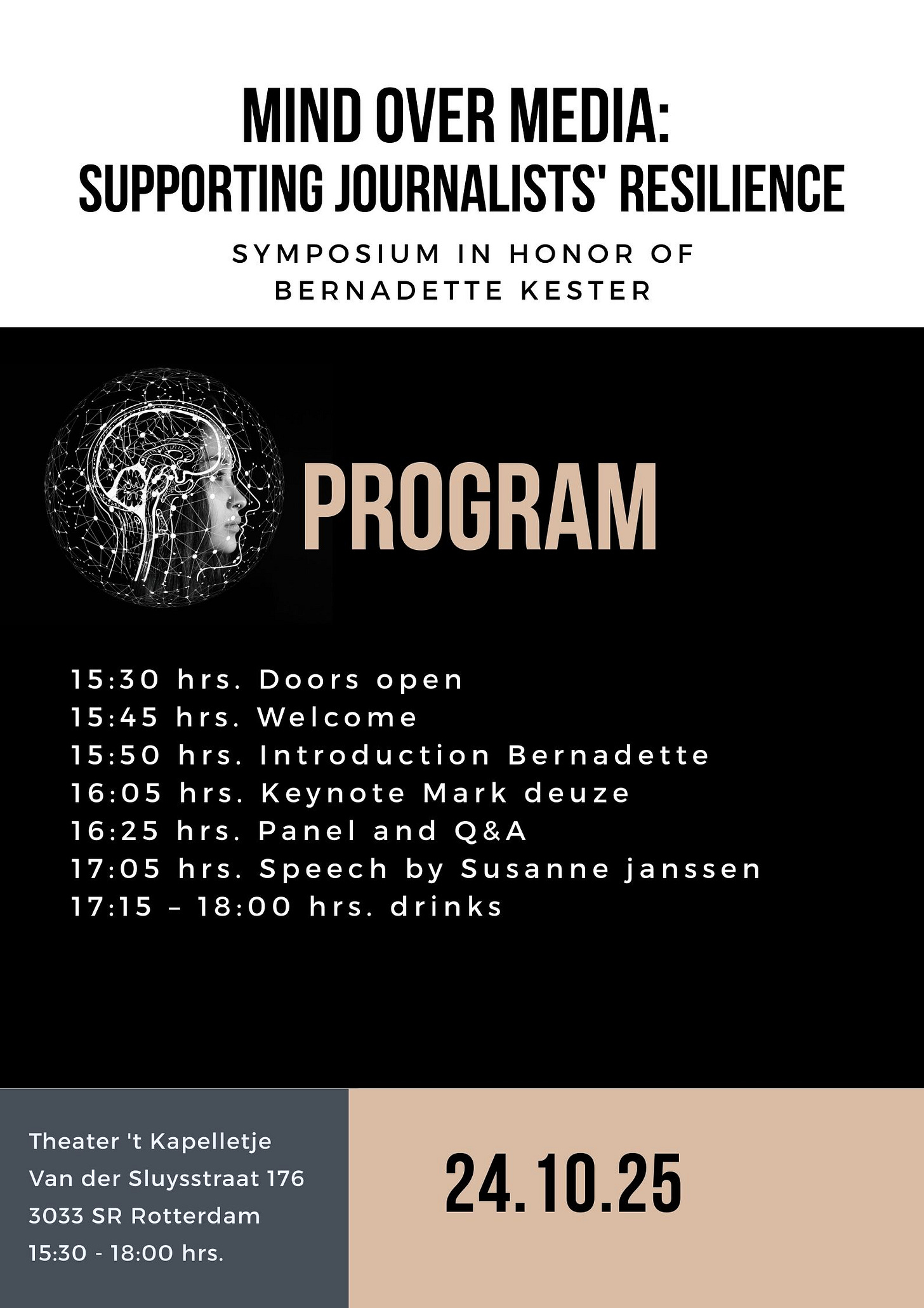 Keynote at a special symposium on supporting journalists’ resilience by Erasmus University at Theater ‘t Kapelletje in Rotterdam, The Netherlands.
