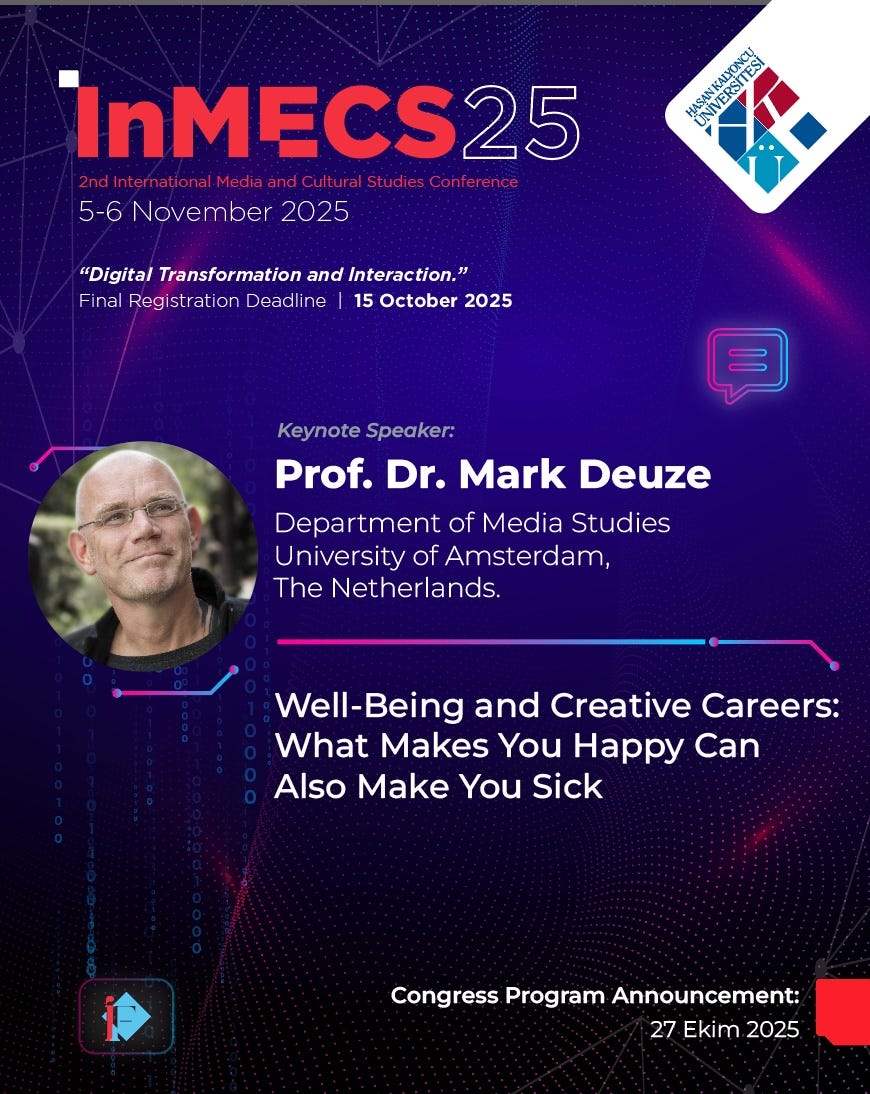 Confirmed dates for 2025 listed below - 2026 to follow (including stops in Sweden, USA, Australia, South Africa, and more). Please contact me if you would like to schedule a talk, workshop or other form of participation based on my research on health, well-being and happiness of people working in the media/culture/creative industries.