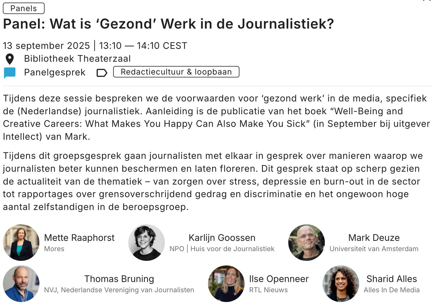 Panel ‘Wat is gezond werk in de journalistiek?’ at the 1st Dutch journalism festival (Nederlands Journalistiek Festival), from 13:10 to 14:10 in the Bibliotheek Theaterzaal in Deventer (in Dutch).